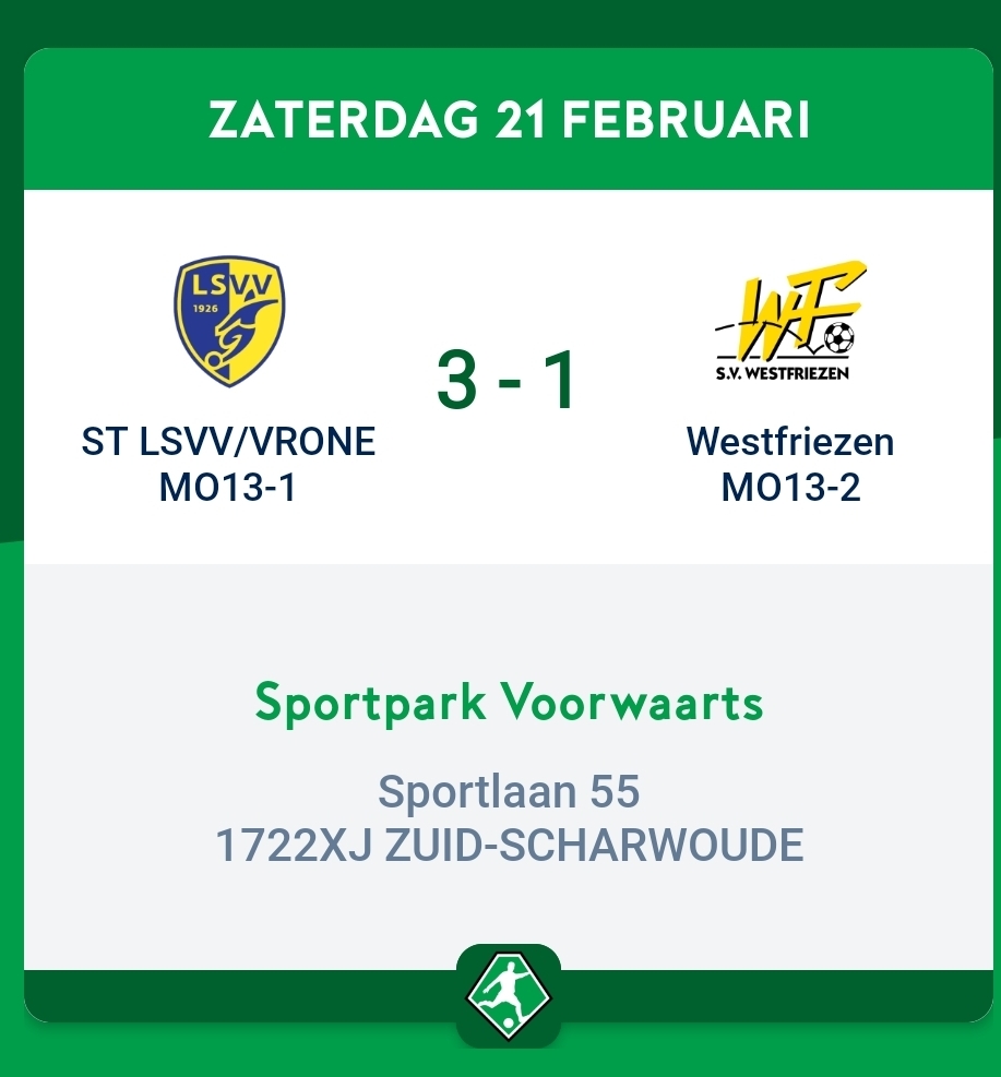 Na een uitstekende tweede fase promoveerde LSVV MO13-1 naar de 1e klasse. In deze nieuwe, sterkere competitie bleek het niveau wennen en hebben zij moeite om mee te komen. Na twee nederlagen was het tijd om weer eens aan de goede kant van de score te eindigen. Op een zonnig Sportpark Voorwaarts stond vandaag het inhaalduel tegen Westfriezen MO13-2 op het programma.